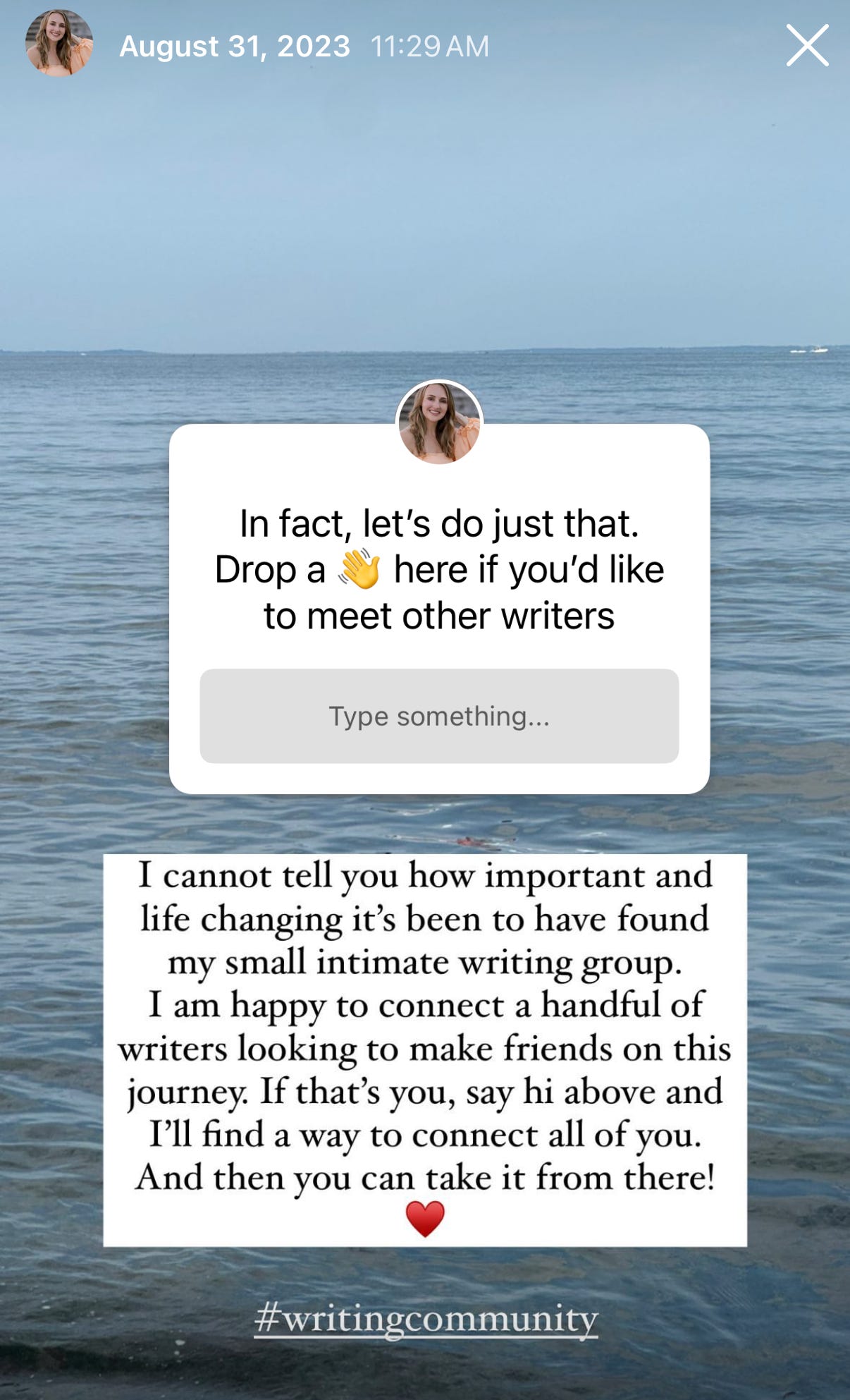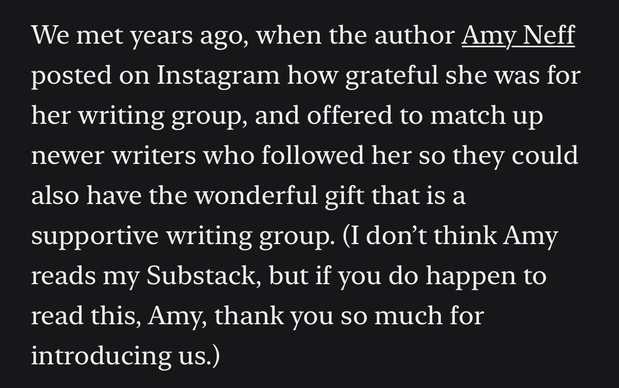 It’s Amy here! Something very cool happened to me recently. To understand the outcome, let’s go back to August 2023. I was in copy edits for The Days I Loved You Most (and slowly descending into madness trying to decipher every tiny decision because it all felt so *FINAL*.) I took sanity breaks to post on my IG stories about said copyedits and about my writing group and how thankful I was to have them throughout the publishing process. And because I was emotional/feeling extra grateful/also very much procrastinating, I posted an open call for writers seeking community via the story, below.